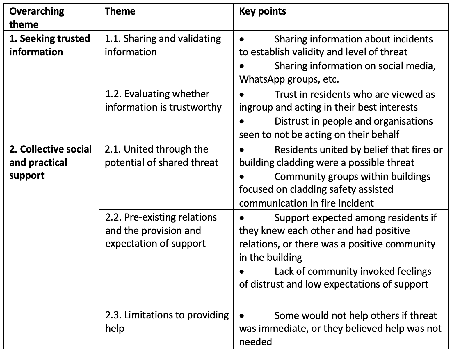 Our projects aimed to address this gap by investigating group processes within the context of residential high-rise buildings in evacuations, with a particular focus on pre-existing social bonds and social influence in decision-making. We analysed interviews with 40 high-rise building residents through the lens of the Social Identity Approach to examine residents’ views of what factors either impacted their perceptions, decision-making and actions during a previous fire incident, or would impact them in the event of a fire in their building.